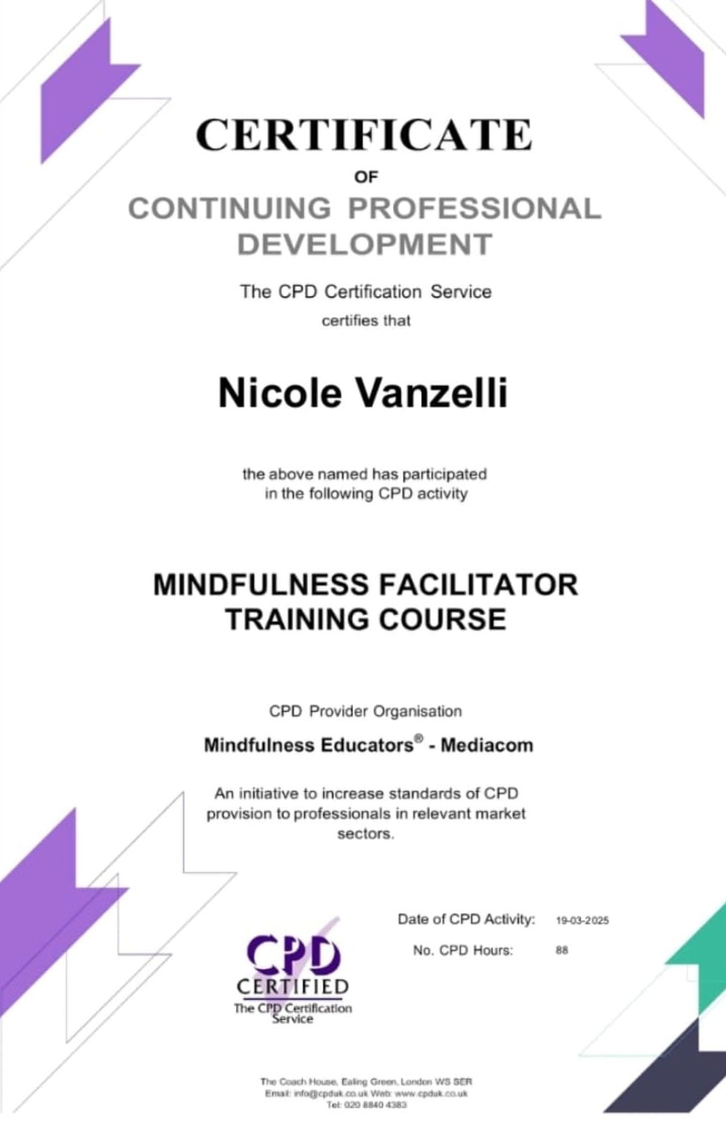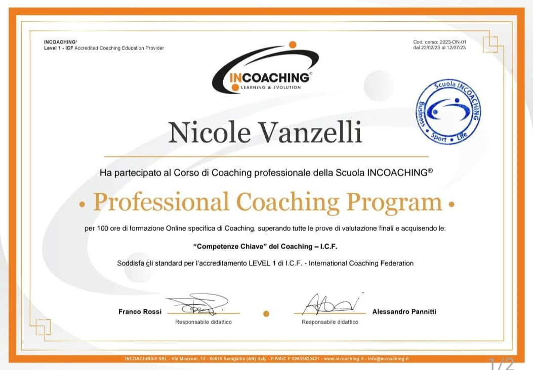 Sono Nicole Vanzelli, Coach Professionista ( ambiti Life, Health e Relationship ) e Facilitatrice Mindfulness.